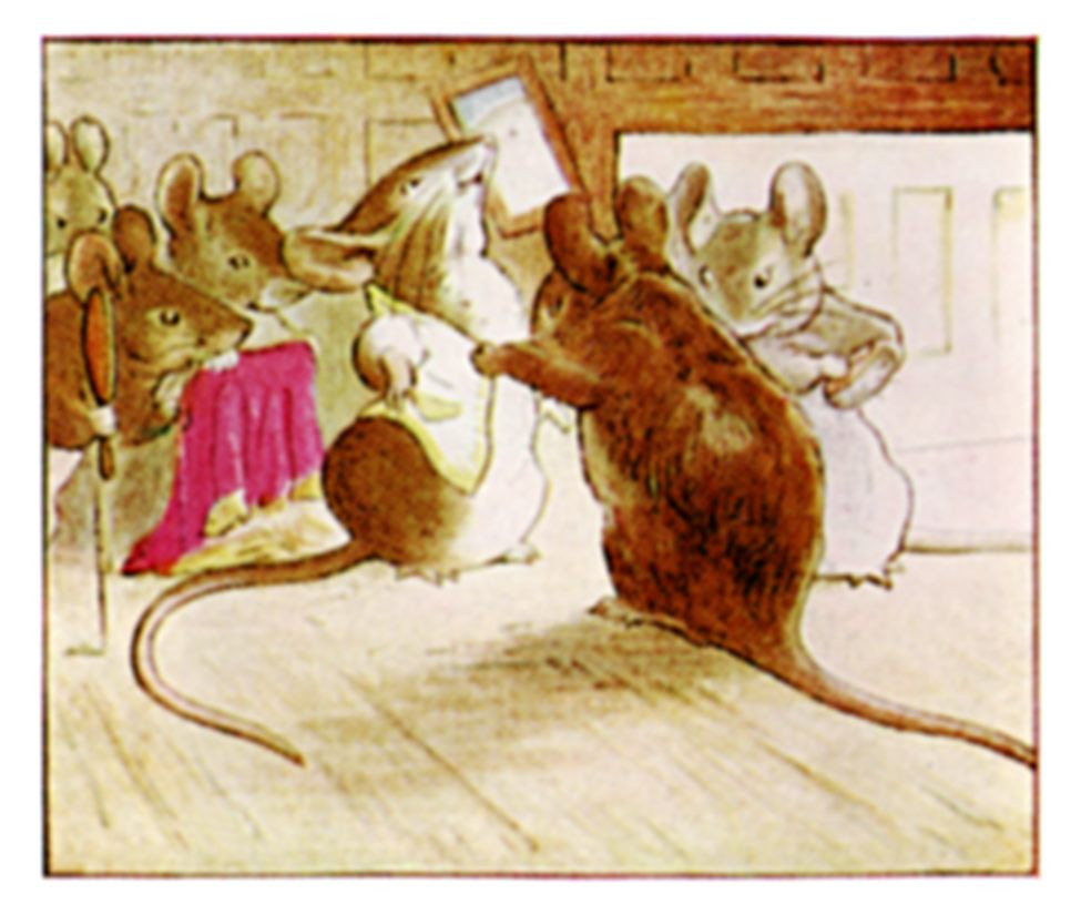 Out stepped a little live lady mouse, and made a curtsey to the tailor! Then she hopped away down off the dresser, and under the wainscot.