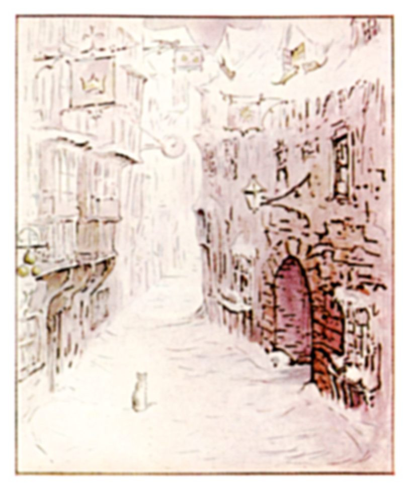 Out of doors the market folks went trudging through the snow to buy their geese and turkeys, and to bake their Christmas pies; but there would be no Christmas dinner for Simpkin and the poor old Tailor of Gloucester.