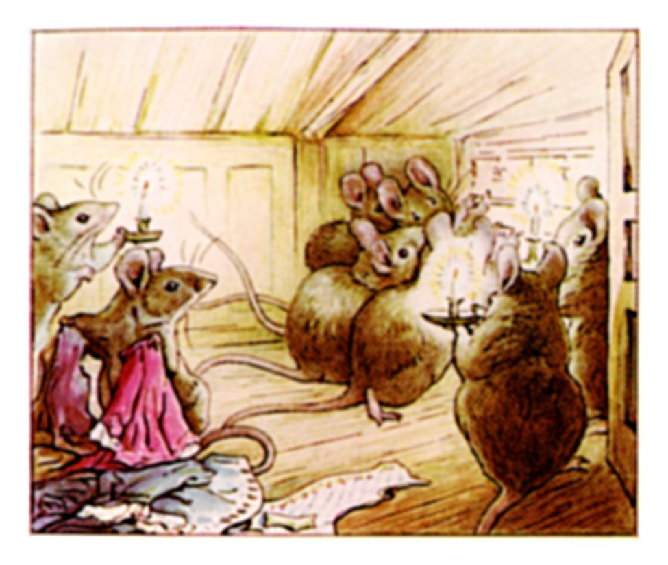 The little mice came out again, and listened to the tailor; they took notice of the pattern of that wonderful coat. They whispered to one another about the taffeta lining, and about little mouse tippets.
