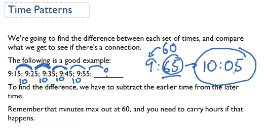 • How's it going math scholars? In today's topic we're going to talk about patterns and time, different time patterns. And if you focus your attention real quickly on this section right here you'll see that I have a basic pattern set out for you. This is 915, 925, 935, 945, 955 and a blank slot for our next time that we should put in there. And we're going to learn how to find that next time and how to find the pattern that exists between all these different times. Now some of you guys might be already noticing hey there's a 1, 5, 2, 5, 3, 5, 4, 5, 5, 5, 5 in the 10s column, 10s unit place of the minutes. So I wouldn't suggest that it's probably 10 minutes right that the difference between in this 10 minutes. But some of you guys were a little bit more skeptical and very much want to inquire into really if this is the truth, we'll want some mathematical proof and I'm going to offer you some proof. So we're going to find the difference. So I'm going to think about real quickly, what is the difference between 915 and 925? And I see that that difference is 10 minutes. And what's the difference between 925 and 935? And difference once again is 10 minutes. 935 and 945 is another 10 minutes. So the difference between all these five different time points is 10 minutes. Make sure that you're finding the time difference between each of these two. Sometimes it's easy to do this one and then forget about it and then do this one because you're thinking, oh I already covered 925 but you can't forget about this gap. So we see that the difference is 10 minutes, which means that the difference between our mystery one here and 955 should also be 10 minutes. So some of you guys are probably thinking, I'll just add 10 minutes. And I'm going to add 10 minutes. And after I write this, you're probably thinking something is a little fishy here. Something is a little bit wrong. I added 10 minutes, right? One from 5, 55 to 65. Well, I did do something wrong. I did it on purpose. It's probably because, and you know I did something wrong, probably because you're just geniuses at time already. But you'll notice that 65 minutes and hour is only 60 minutes. How do I have 65 minutes? Which means that when I add 10 minutes, 60 of these minutes, 60 out of these 65 can turn into another hour, which I can add to the 9. And that's exactly what I'm going to do. I've added an hour to my 9, so it's now 10 o'clock. And if I take 60 away from here and add it, what how many minutes do I have left? I have exactly five minutes left. And now I'm at 10-0-5. So those should be all the skills that you need. Remember, the key here is to find the difference between each two numbers that are side by side. And try to figure out if that's the same pattern that you see between all the other two numbers that are together. And if you can conclude that that's the same pattern, then you can find any blank, any question mark that is not you. Good luck!