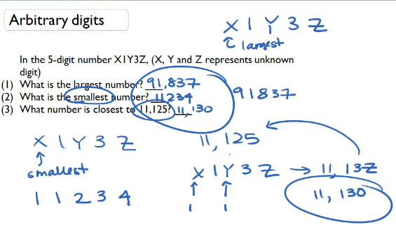 Arbitrary digits. In the five digit number, x1, y3, z, where x, y, and z represents unknown digits. What is the largest number? x1, y3, z. If we want the largest number, we're going to put the largest digit in x. The largest digit is 9. Then for y, it's going to be an 8. For z, it's going to be a 7. So our largest number is 91,837. What's the smallest number? So we're going to rewrite x1, y3, z. Our smallest number means we're going to put our smallest digit on the left side. So it'd be 1, 1. Then 2 is our second smallest, and 3, and 4. 1, 1, 2, 3, 4. Our next question is what number is closest to 11,125? So we have x1, y3, z. Well, we want to get to 11,000. So we're going to put a 1 in our thousands. We want to get to 125. So we're going to put a 1 in our hundreds. And because we now have simplified this to 11,030 something where we have to figure out the z, we want to make it as close to 125 as possible. So we're going to set our z as 0. So this is going to be the number closest to 11,0125. So these are three answers.